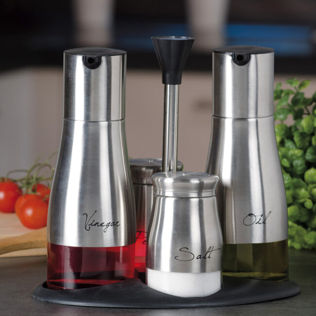 SET OF 4 MENAGE GLASS & STEEL (OIL, VINEGAR, PEPPER & SALT) 21.5X16XH21CM