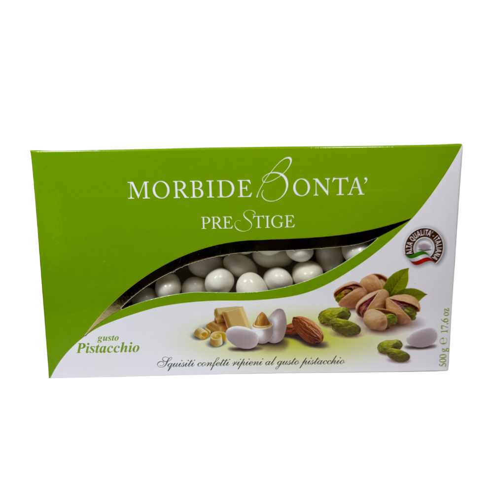 Delicious pistachio, flavored sugared almonds, filled with milk chocolate covered with white chocolate.
