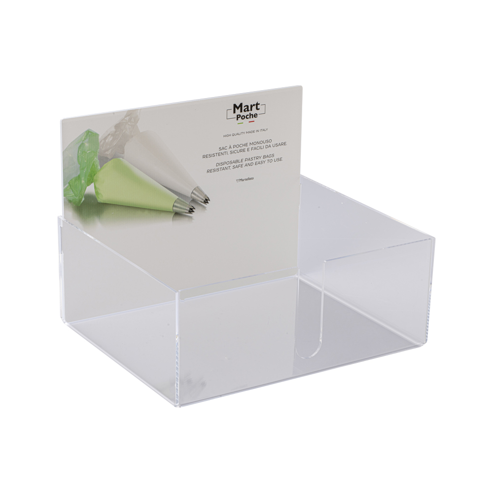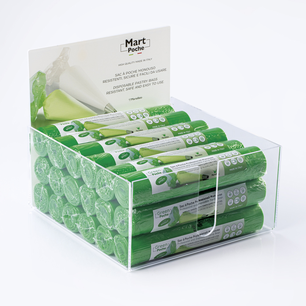 Plexiglass display for 18 rolls of sac à poche of 20 pieces