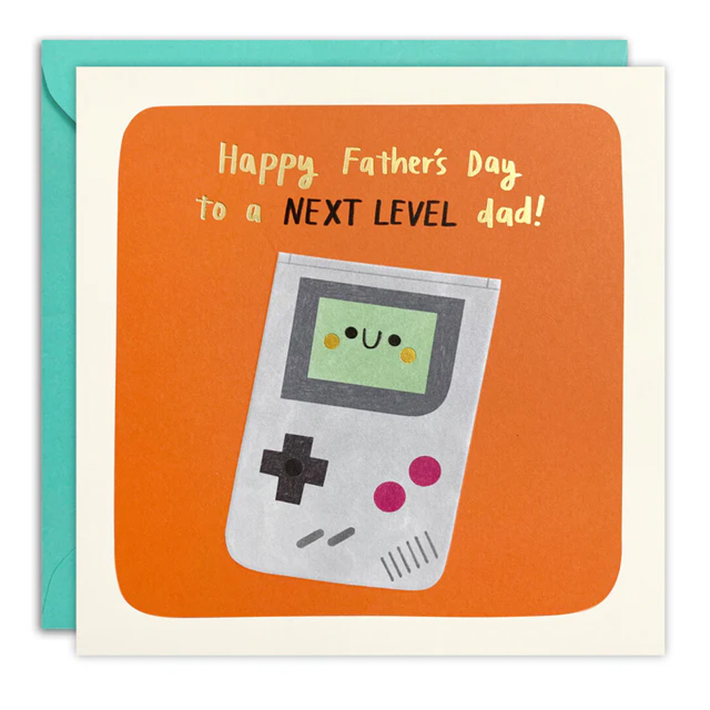 A fun Father’s Day card illustrated by Alice Mole. The image on the front of the card features a classic gameboy with a happy face on the screen. The gameboy is embossed and details within the image are foiled in gold.