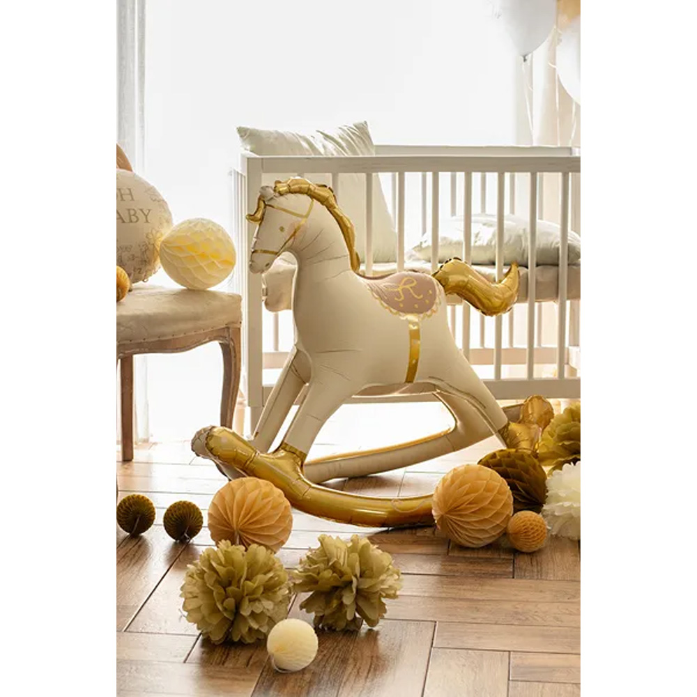 Standing foil balloon in the shape of a rocking horse, mix of colors. Dimensions before inflation approx. 118 cm x 104 cm (46.5 x 41”), dimensions after inflation approx. 106 x 86 cm (41.5 x 34”). To be filled with air. Set includes a straw.