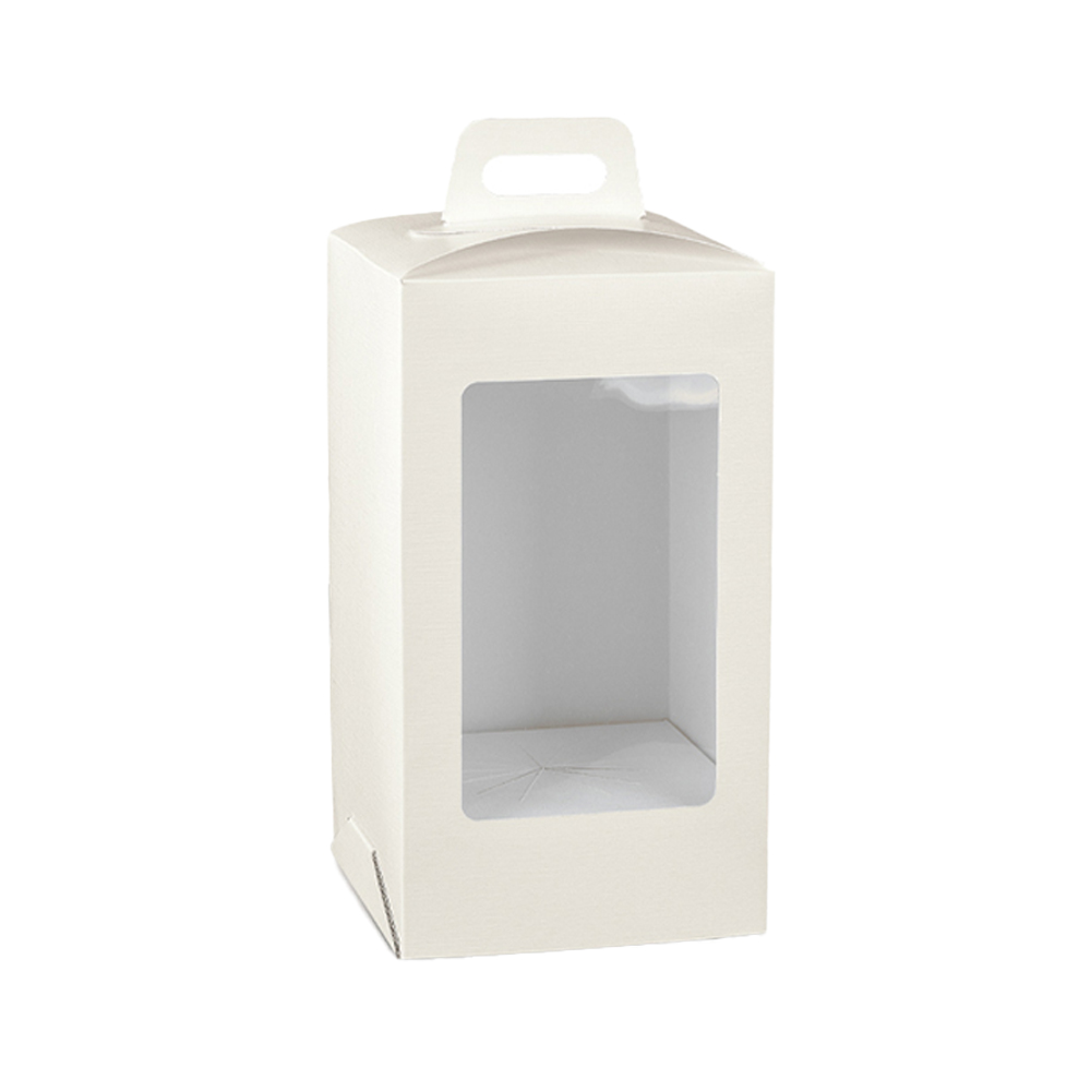 Box made of a bonded cardboard base with a punched hole and a cardboard top with a handle and a PVC front window. It can hold chocolate eggs or figurines.