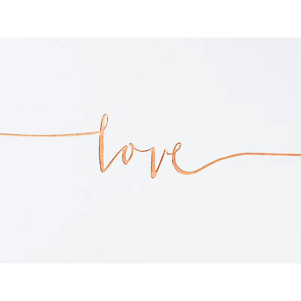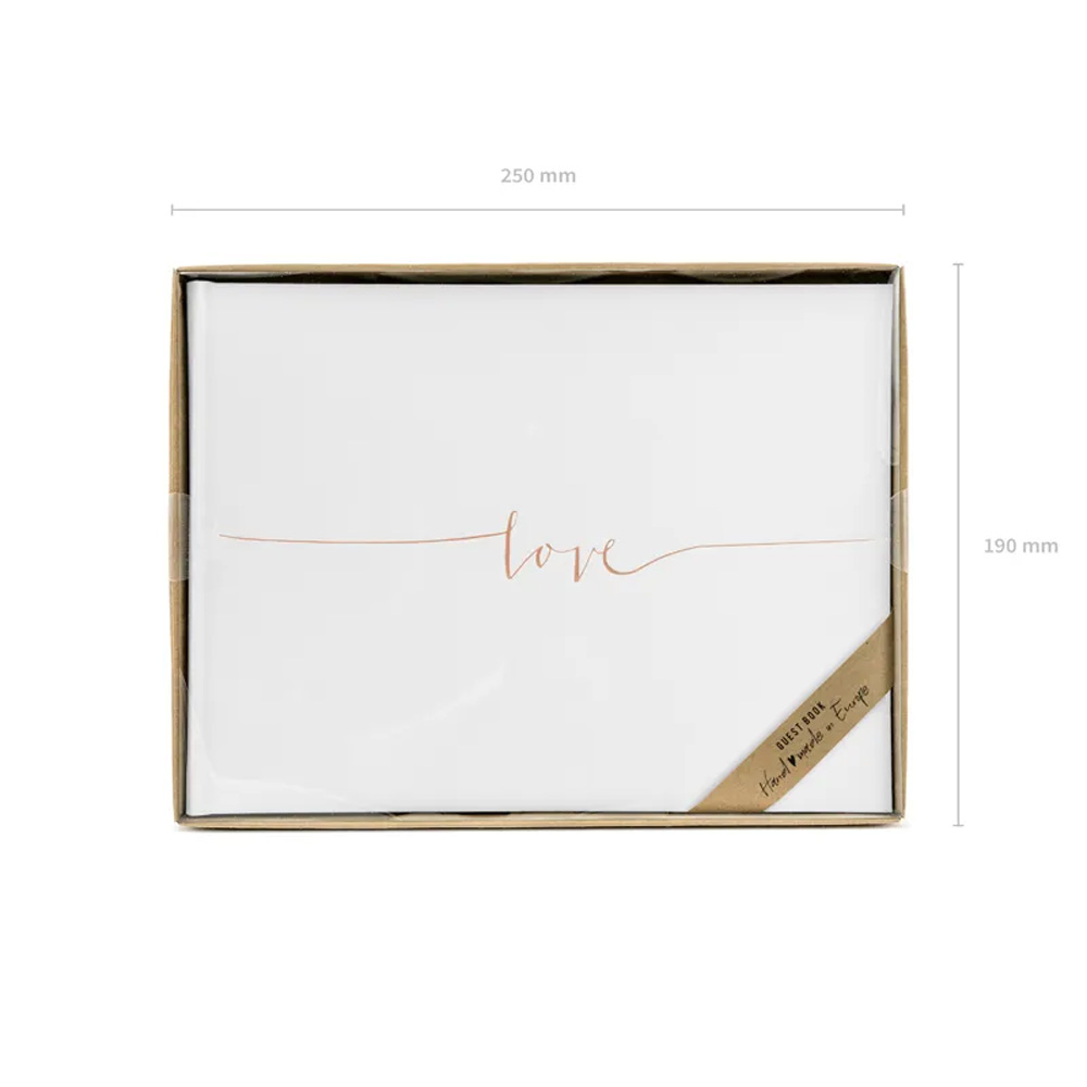 Guest book bound in white paper with a rose gold inscription Love, size approx. 24 x 18.5 cm, 22 pages, without text.