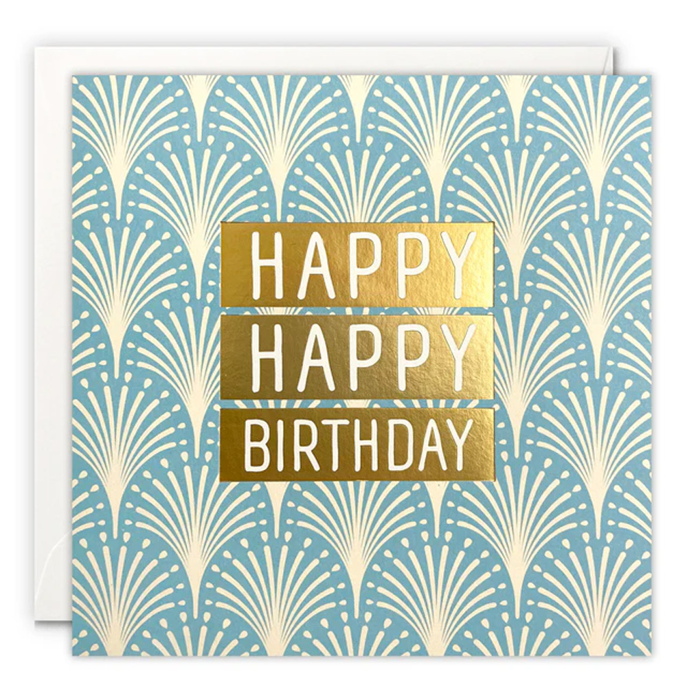 A high quality birthday card printed with gold foil. The front of the card features the words ‘Happy Happy Birthday’ in gold foiled blocks, on a blue patterned background inspired by art deco.
