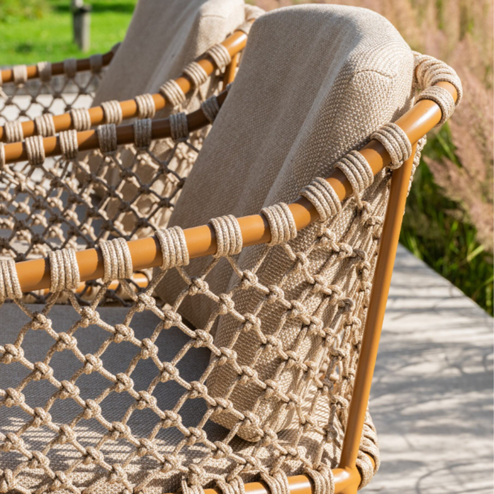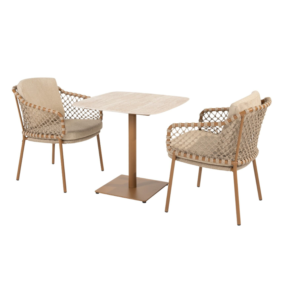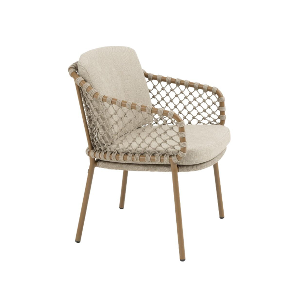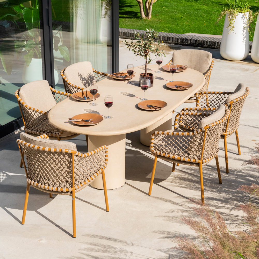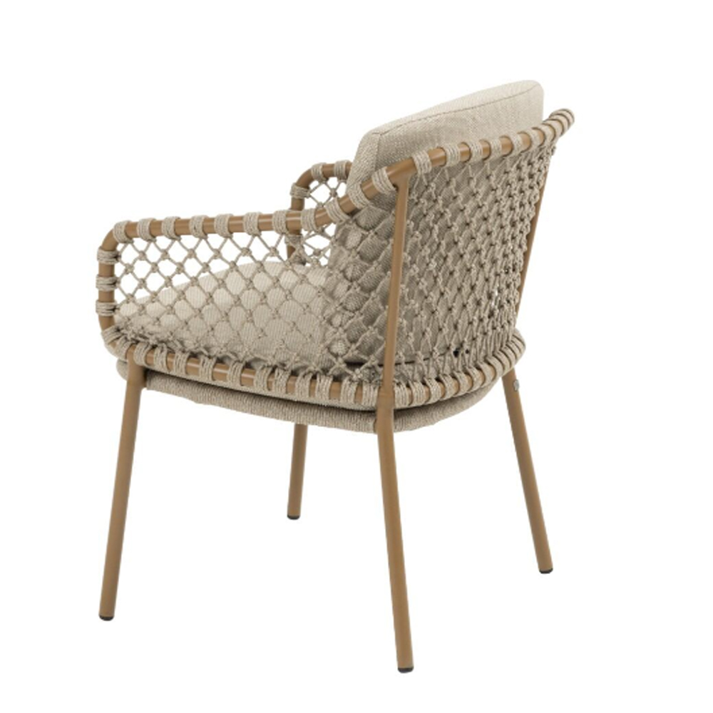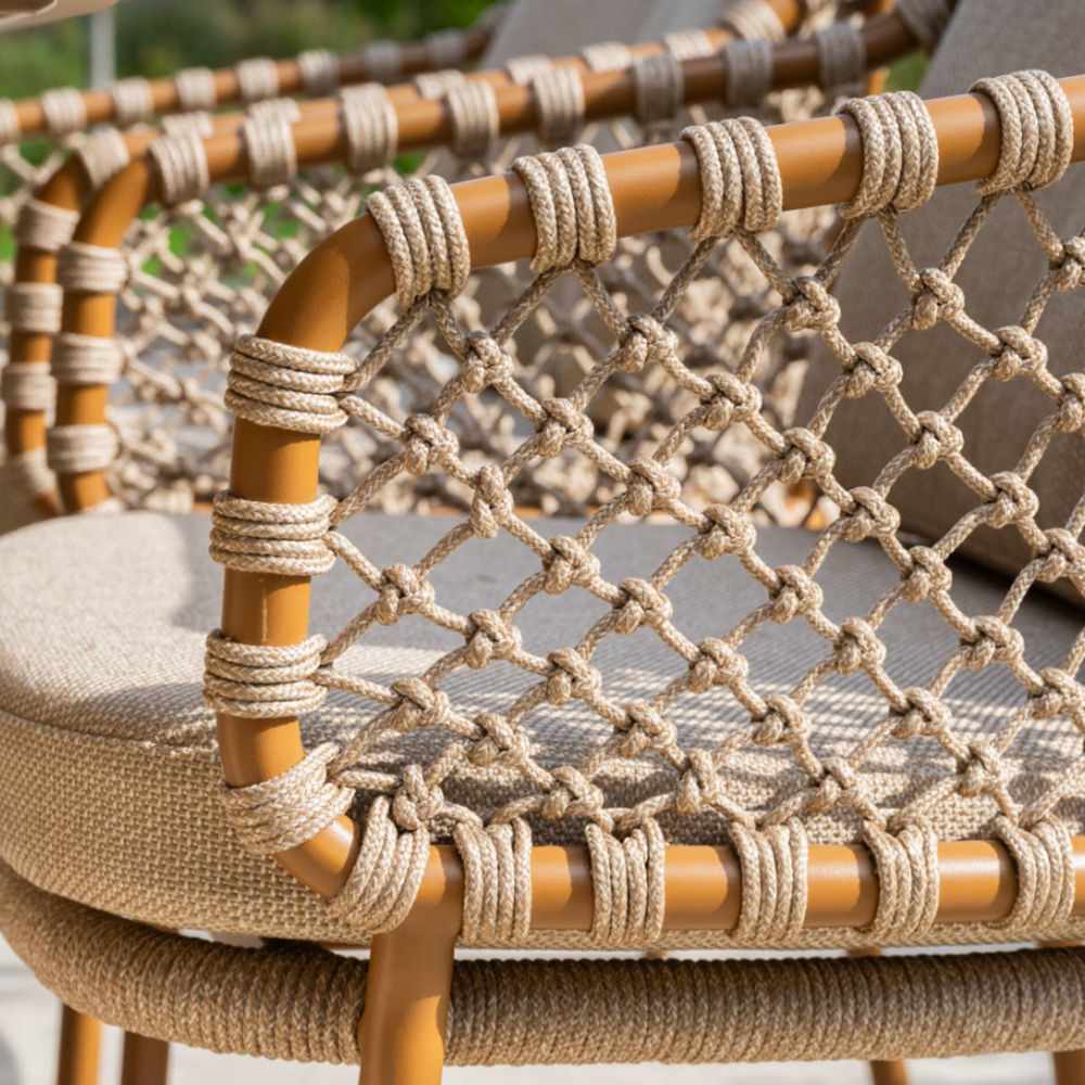 Martinique stands out with its refined rope pattern, creating an elegant and timeless look. The subtle design makes it easy to pair the set with various tables from the collection, allowing you to create the perfect dining set for your terrace.