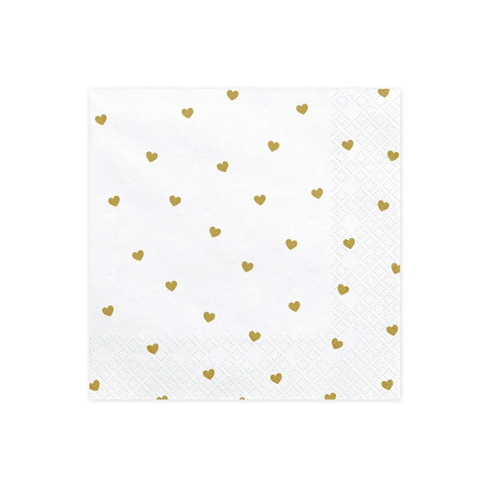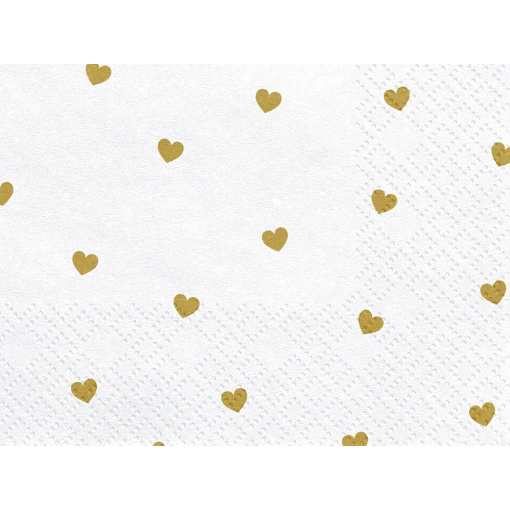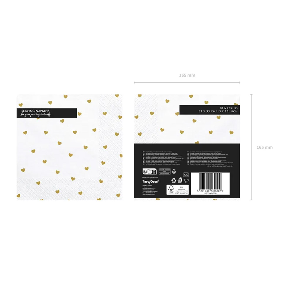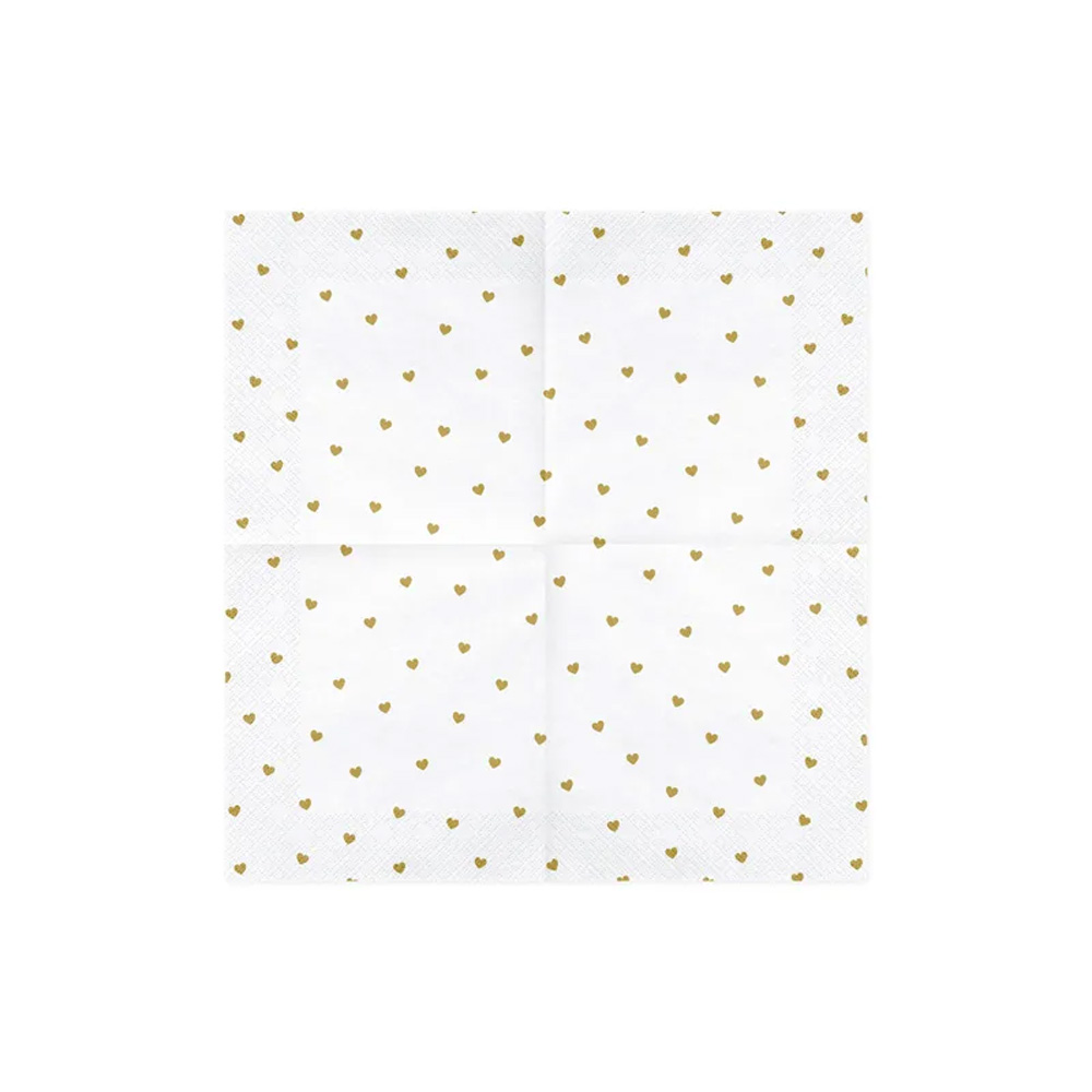 Paper napkins Hearts, white with a gold print, size after unfolding approx. 33 x 33 cm, size after assembling approx. 16.5 x 16.5 cm.
