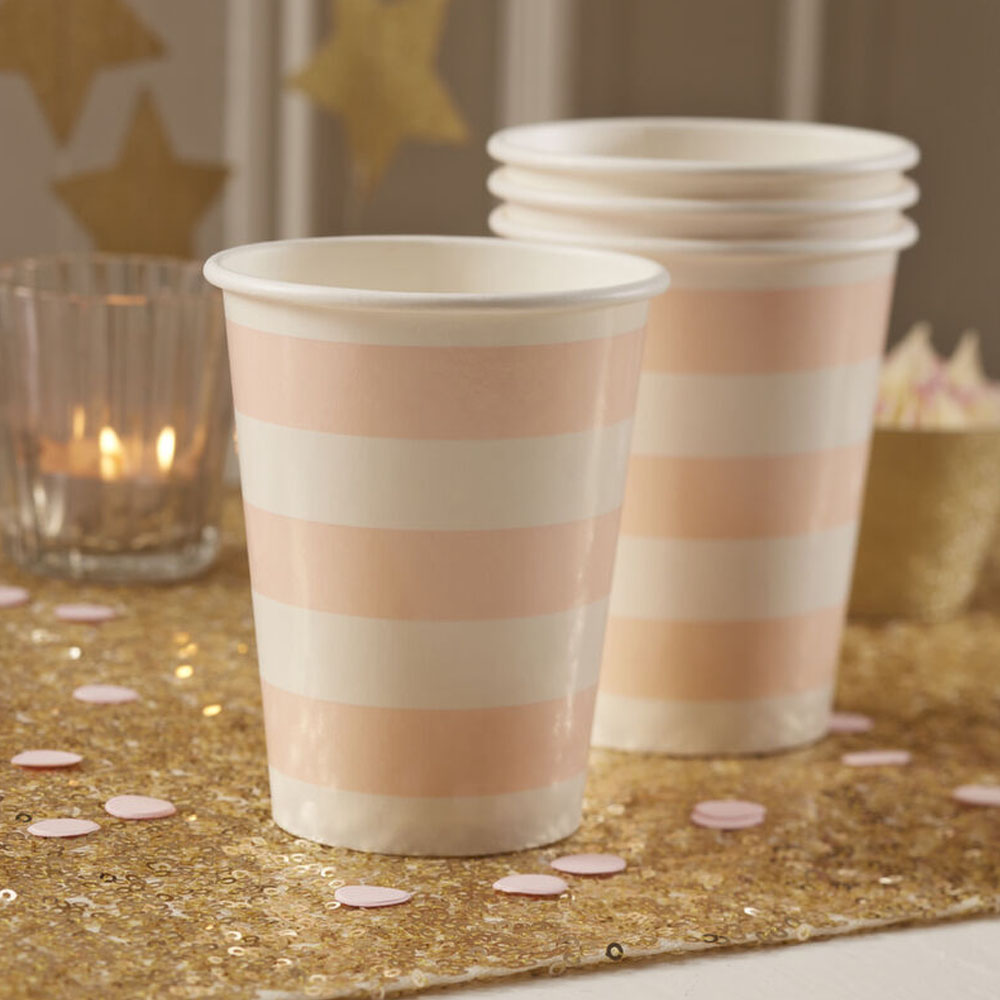 Striking and stunning pastel pink striped paper cups. Perfect for any celebration or get together, can be used for birthday parties, even baby showers.