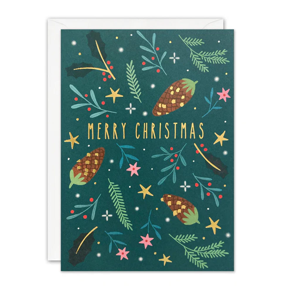 A beautiful Christmas card illustrated by Bea Müller. The image on the front of the card features pine cones, stars and Christmas foliage on a dark green background. Elements within the design are foiled in gold.
