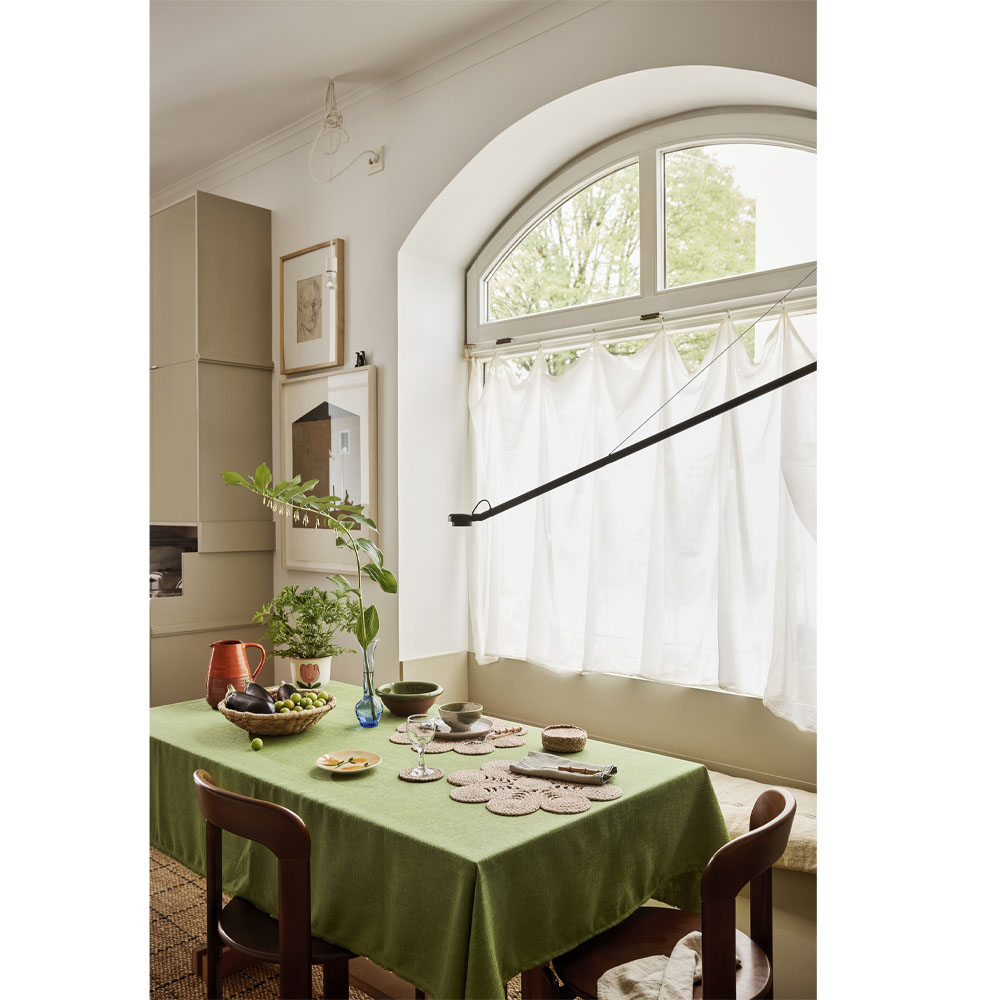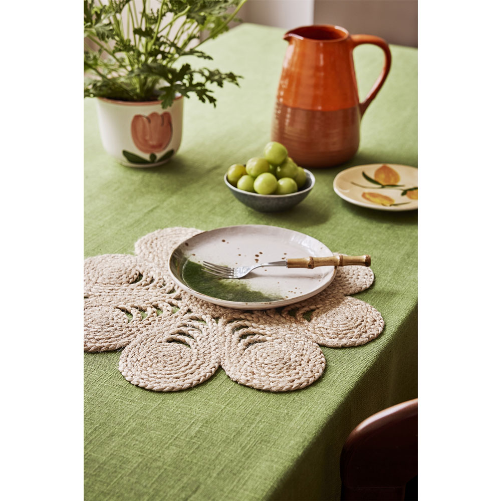 The originally rough jute fiber is processed into a soft smooth fiber that is well suited to use as a thread for this handmade placemat.