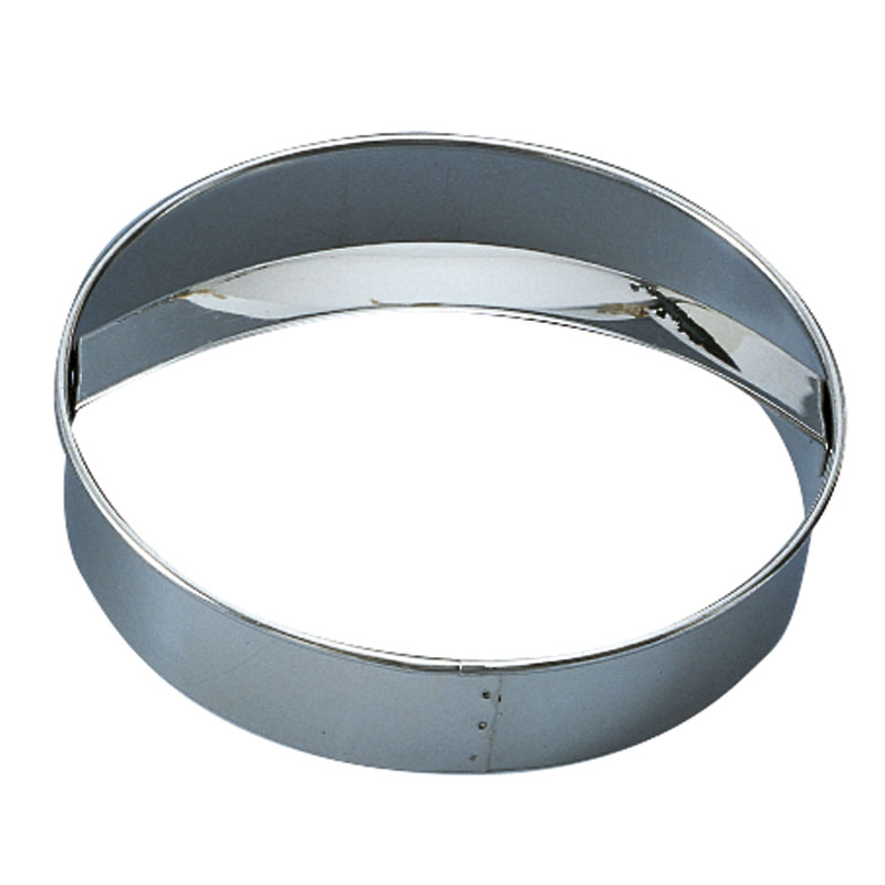 Round stainless steel pasta cutter, with smooth edge for precise cuts and handle.