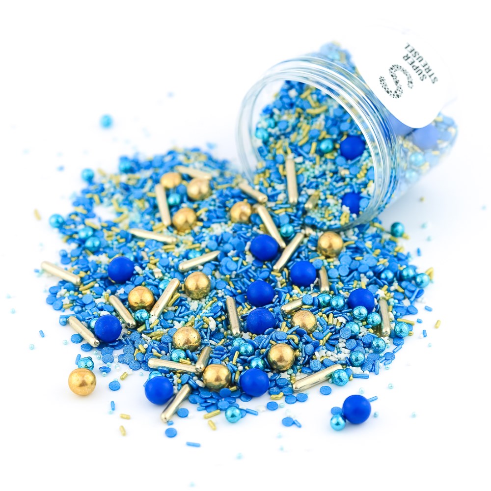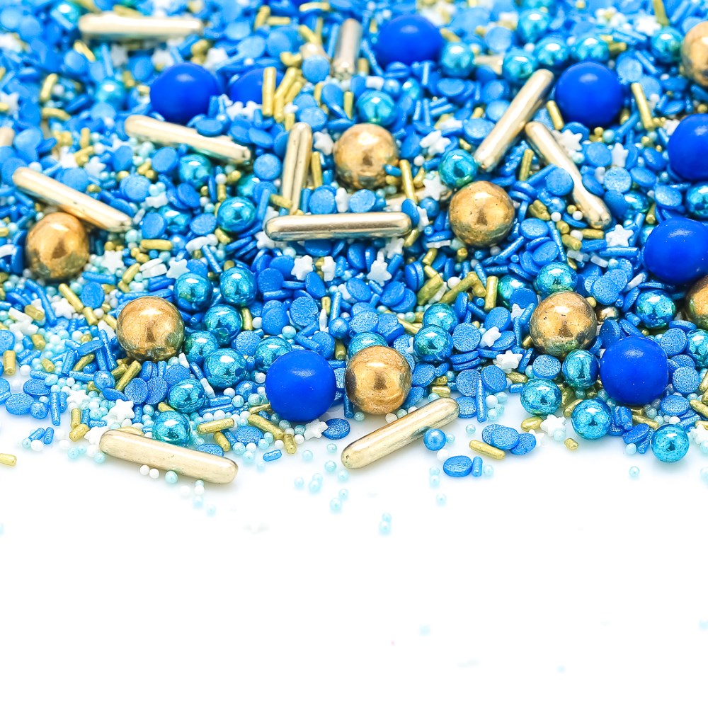 Your Highness, may we ask? May we please sprinkle everything that we come across in baked goods in the kitchen? Cake, cupcakes, biscuits, pretzels or a few typical British scones ?! This royal sprinkle mix brings us completely out of the concept with its regal elegance. Deep blue and golden chocolate balls (that alone would be worth a mix … note to ourselves …), metallic-shimmering crispy pearls , confetti sprinkles , white sugar stars and golden sugar sprinkles… hui da the heart of every aristocratic expert formed from gossip magazines beats little somersaults. With curtsey. And as a precaution we bow to you, because we already know that you will conjure up something really noble with these colorful sprinkles .