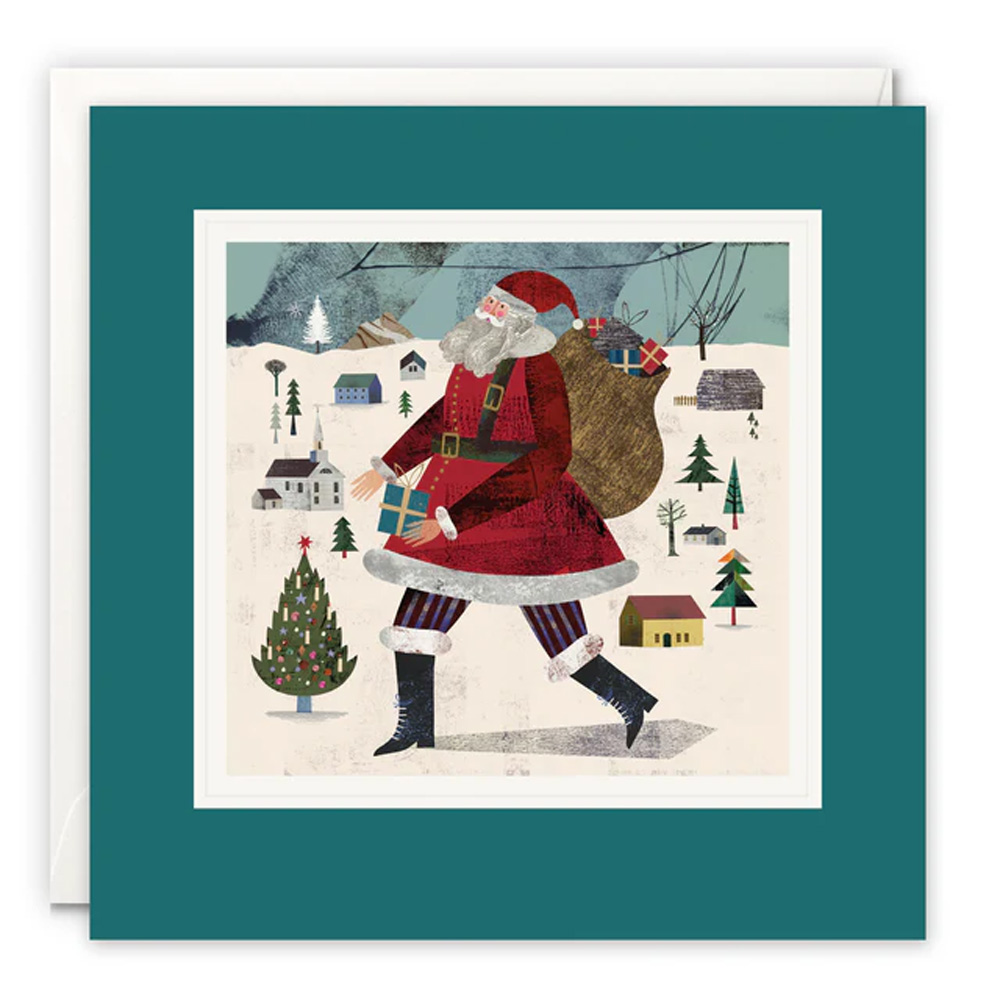A high quality blank art card for Christmas by Martin Haake. The artwork on the front of the card features a large Santa Claus in a red coat, walking through a snowy village. It is titled ‘Santa’.