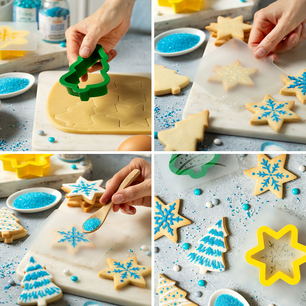 A set of two plastic cookie cutters, perfect for shaping cookies or creating sugar paste and gum paste shapes and toppers, and four food-safe plastic stencils, perfect for creating three-dimensional designs with royal icing, buttercream, powdered sugar, cocoa powder, colored powders, spray paint, or an airbrush. For perfect cookie results, flour the mold before using it on the dough.