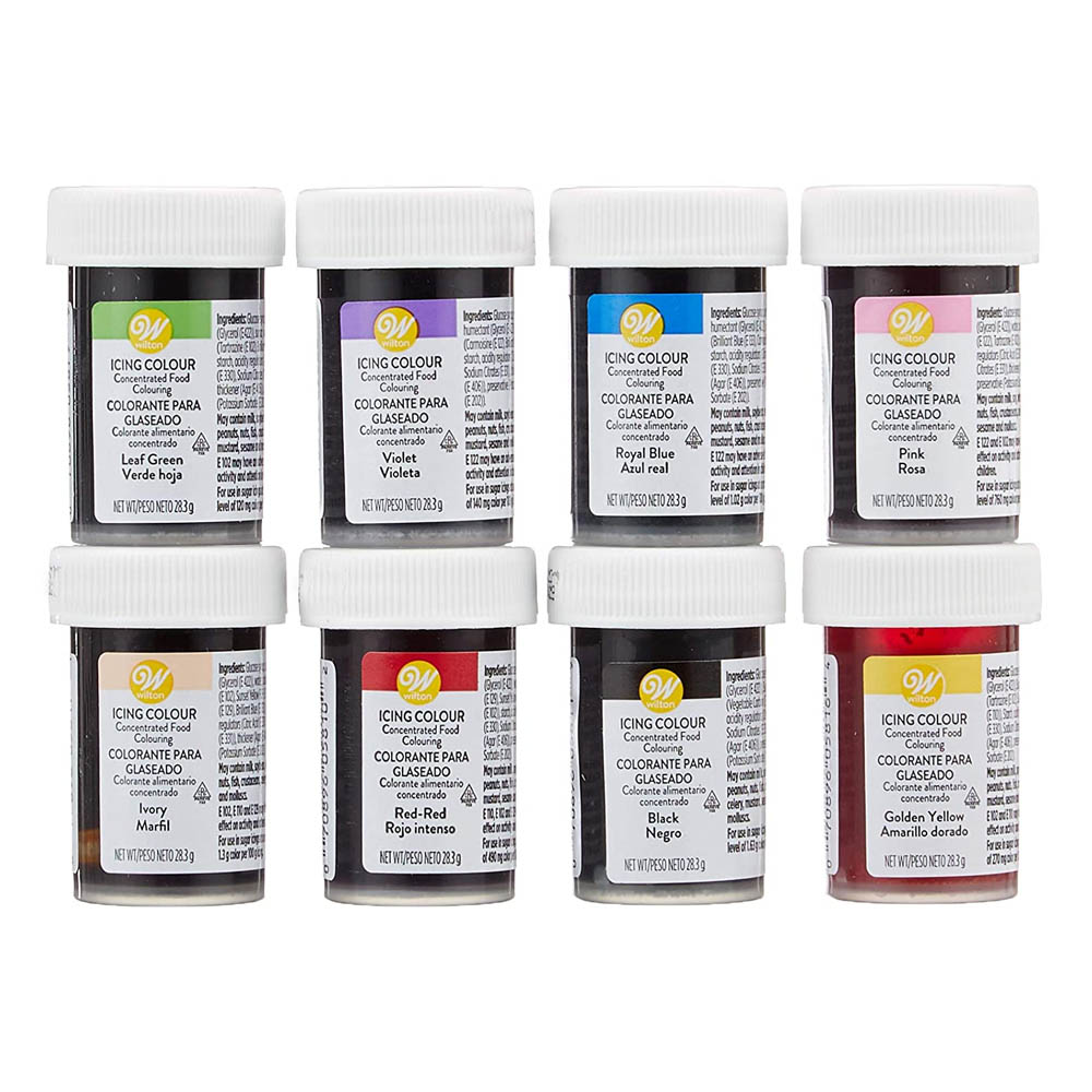 Simply add a beautiful colour to your buttercream, fondant, marzipan, gum paste, icing, batter, cookie dough and more with this 8-piece set from Wilton. The set contains the following concentrated food paste colourings: Golden Yellow, Violet, Royal Blue, Red Red, Pink, Leaf Green, Ivory and Black.