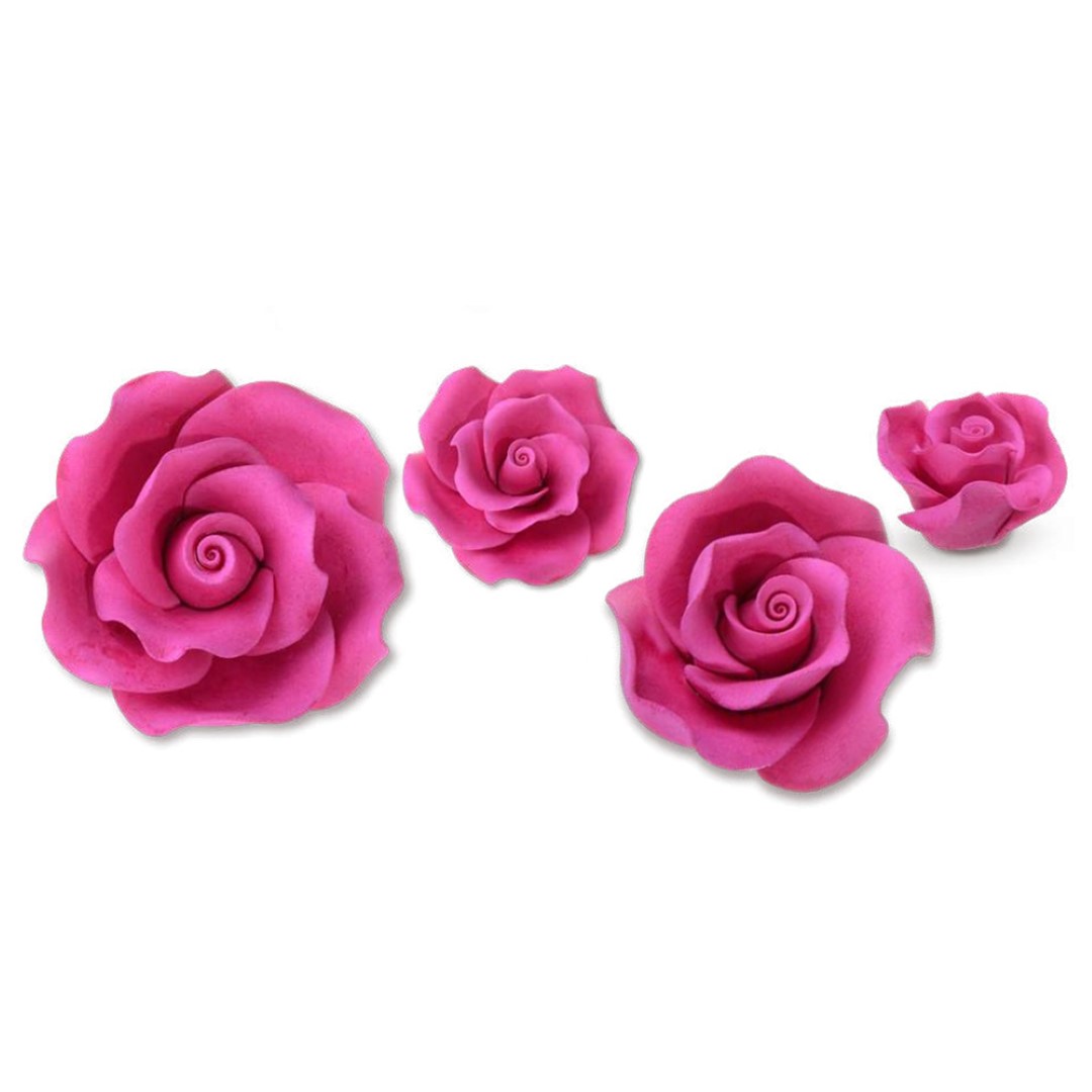 Set Of 17 Sugar fucshia Roses. Dimensions: 4/5.5/7/8 CM. Available in 4 sizes: small, medium, large & x-large.