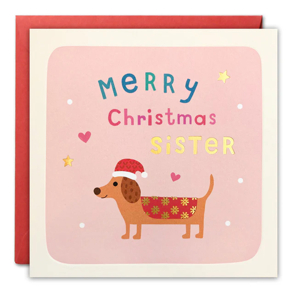 A cute Christmas relations card for a sister, illustrated by Sally Payne. The image on the front of the card features a dachshund sausage dog wearing a Christmas hat. Details within the image are foiled in gold.
