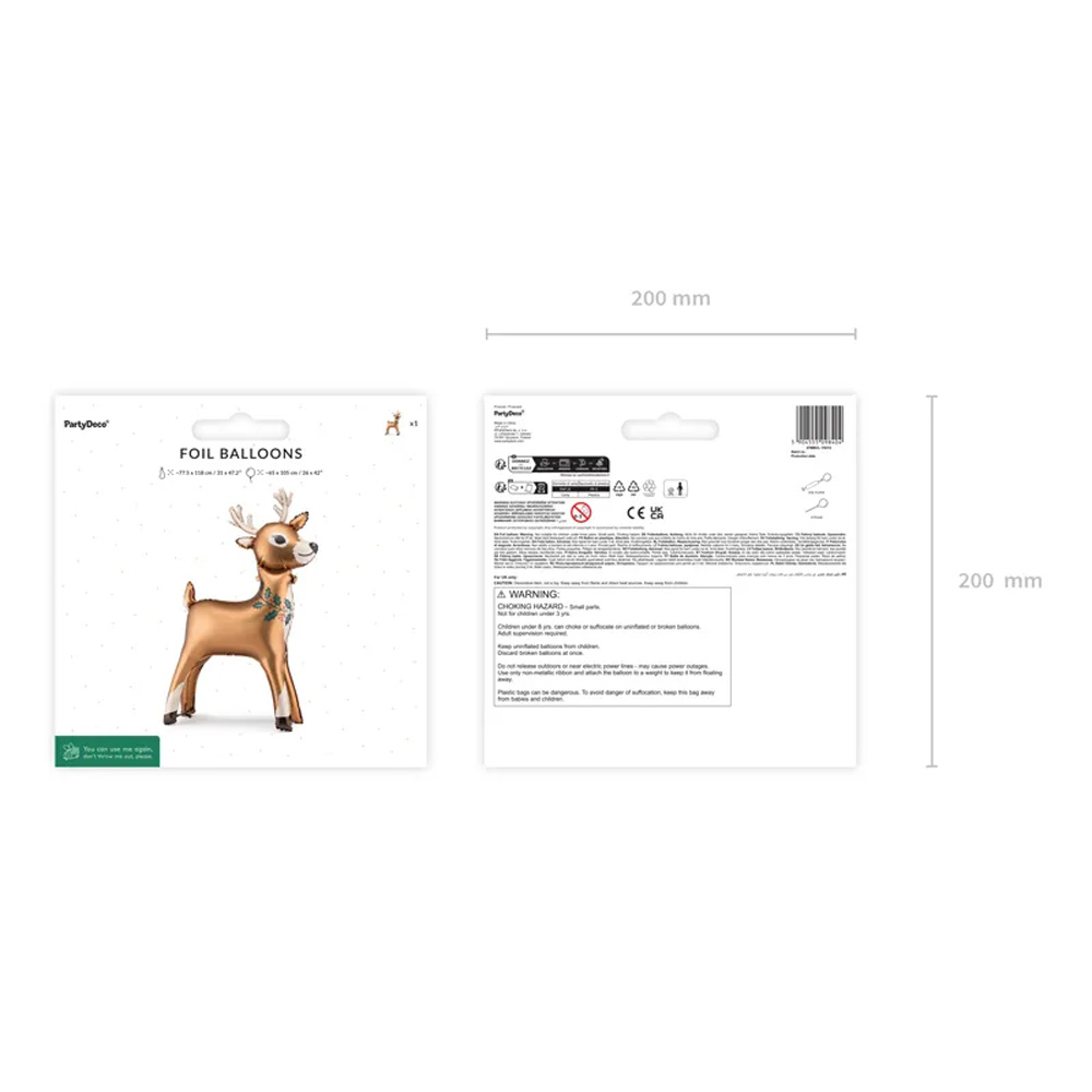Standing foil balloon Reindeer, mixed colors, dimensions before inflation approx. 77.5 x 118 cm (31 x 47.2”), dimensions after inflation approx. 65 x 105 cm (26 x 42”). To be inflated with air. Straw included.