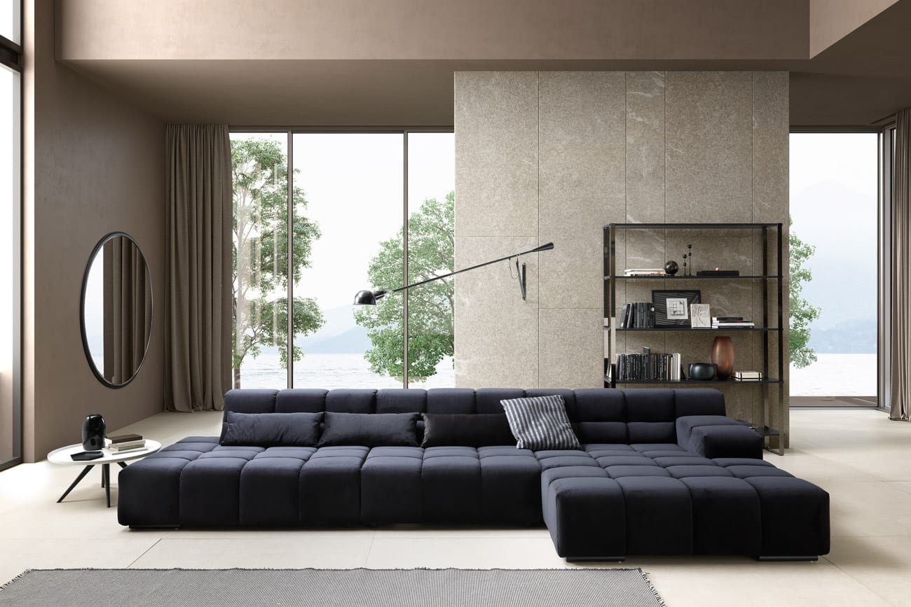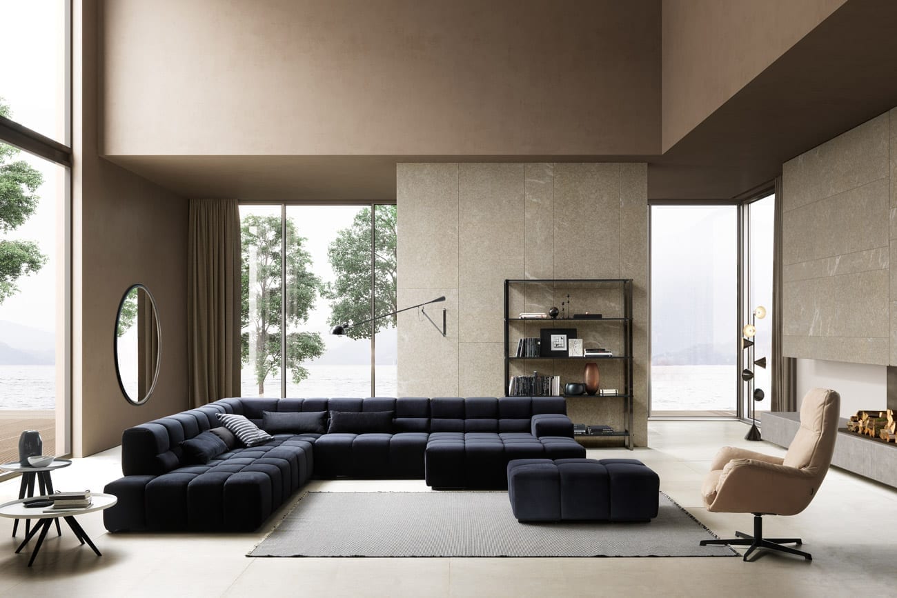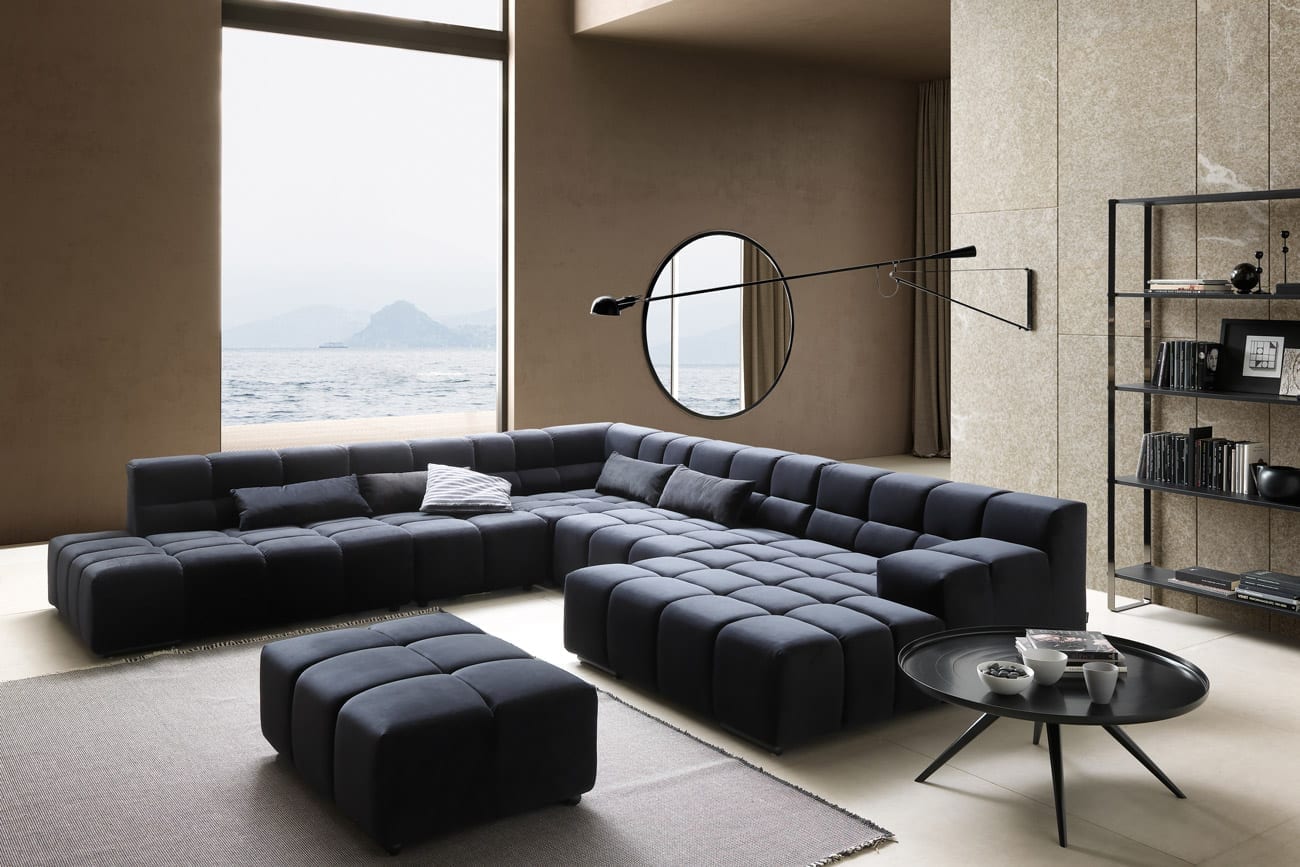 The flexible beauty: A temple of coziness. The Temple’s alluring character is inspired by both the Chester-field and Capitonne styles, influenced by the 60s and 70s. That era’s signature reveals itself in the free, informal style of the sofa, which can be individually configured: conventionally, with a relaxing chaise longue, as a corner sofa or as a free-standing oasis of well-being.