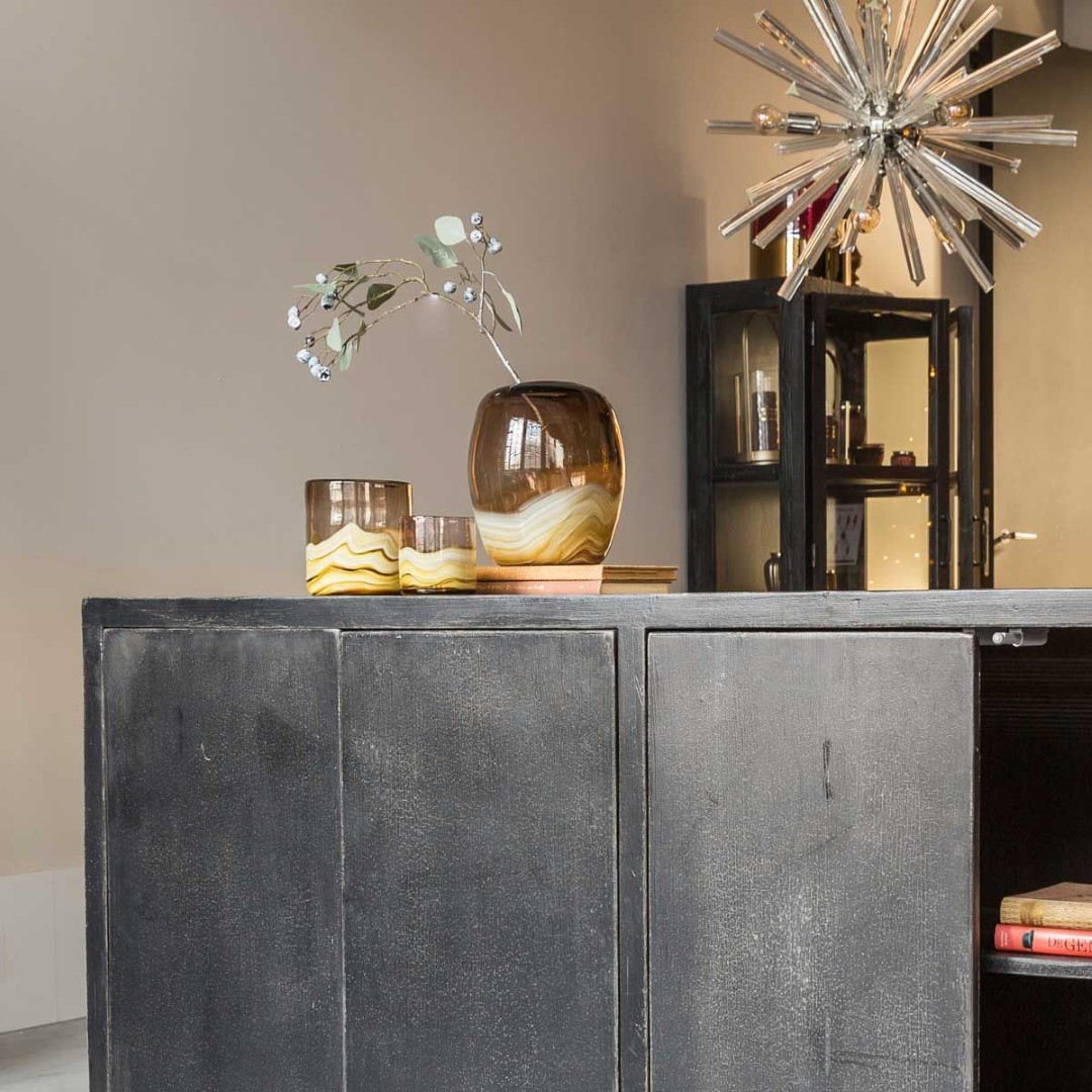 This hurricane is the largest model of the two and has beautiful, natural colours. The translucent glass has a smoked effect, making it a little darker than normal glass. The colour combination of this tea light holder creates a warm atmosphere. The hurricane is handmade, which means that each one is just a little different.